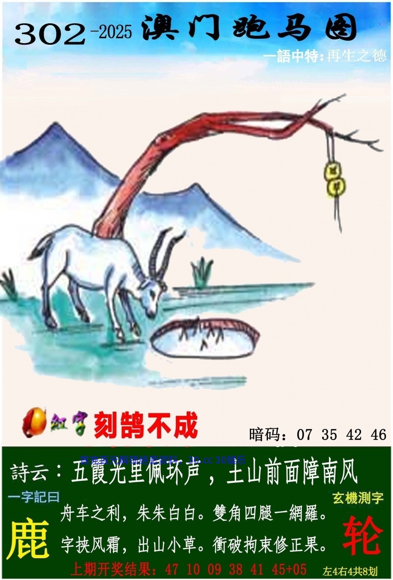 302期一字記曰:【鹿】 舟车之利,朱朱白白,双角四腿一网罗。字挟风霜,出山小草,冲破拘束修正果。 玄机测字《轮》 解:双角四腿一网罗:双角四腿解双肖虎马狗猴龙鼠。 综合取肖:虎马狗猴龙鼠 综合取码:16.40.12.48.20.44.22.46.26.38.18.42 综合两波:绿波+红波 |